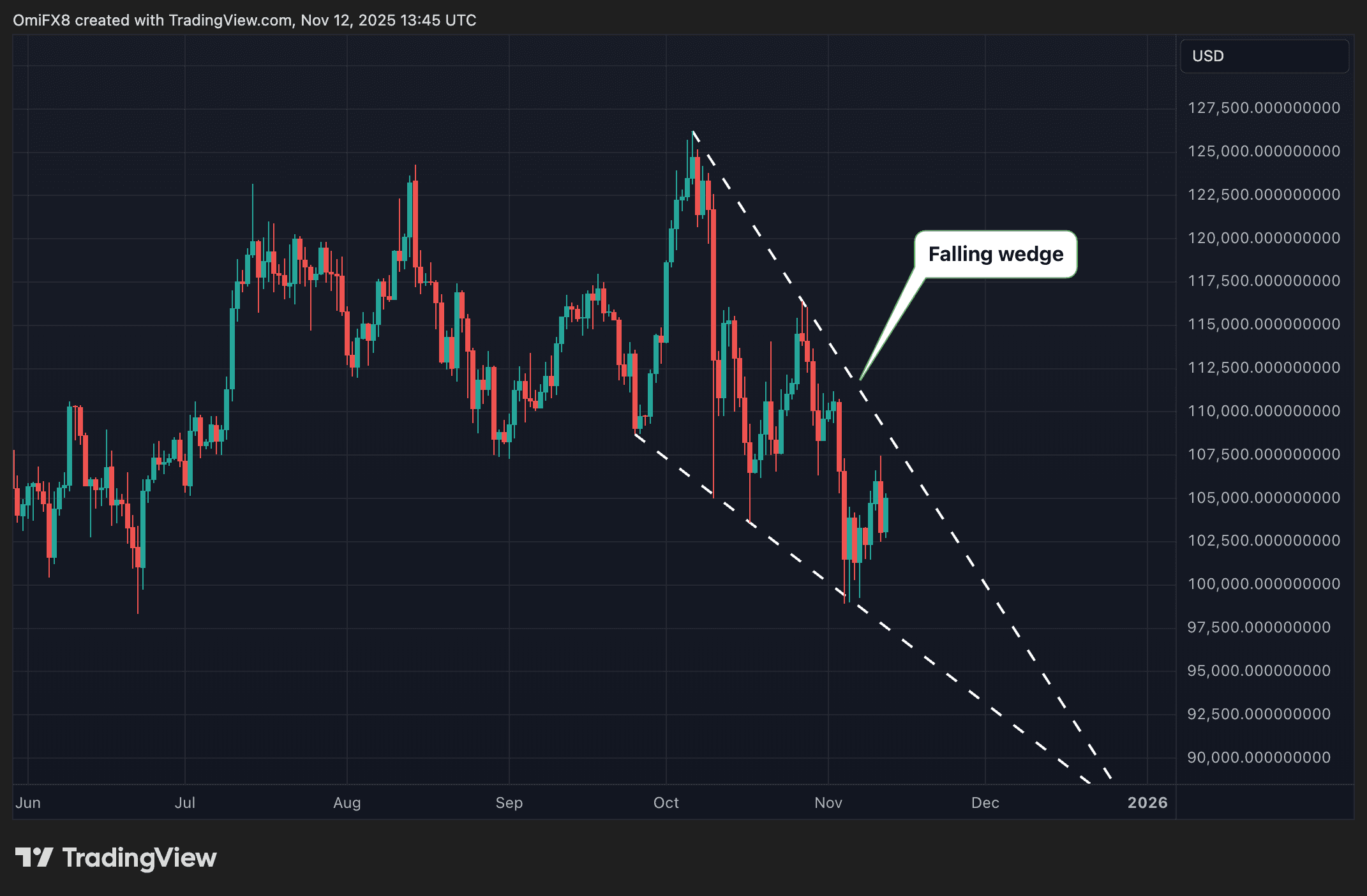 That’s the message from the price chart, which shows the sharp pull back from the record high of $126,000 on Oct. 8 to recent lows near $106,000, which has left many bulls demoralized, is quietly shaping a classic bullish technical pattern known as a falling wedge.
