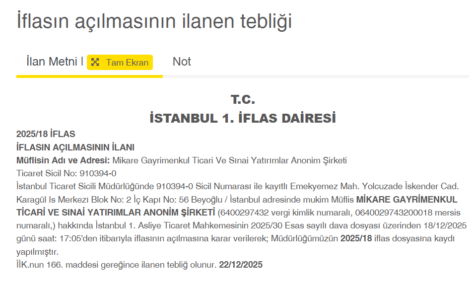 Ayrıca, iş adamına ait Mikare Gayrimenkul Ticari Ve Sınai Yatırımlar Anonim Şirketi’nin de iflasına karar verildi.