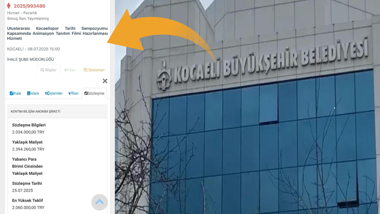 Kocaeli Büyükşehir Belediyesi, 8 Temmuz 2025 tarihinde “Uluslararası Kocaelispor Tarihi Sempozyumu kapsamında animasyon tanıtım filmi hazırlanması” adı altında bir ihale düzenledi. İhalenin toplam maliyeti 2 milyon 394 bin 260 TL olarak belirlendi. Ancak asıl tartışma, ihalenin 21/f maddesi kapsamında yapılmasından kaynaklandı. Bu madde, sadece deprem, sel, salgın gibi olağanüstü hâllerde başvurulabilecek bir yöntem olarak tanımlanıyor. Ancak burada herhangi bir olağanüstü durum olmamasına rağmen, ihale pazarlık usulüyle yapıldı ve yalnızca iki firma davet edildi. Bu firmalardan biri ise belediyenin kendi iştiraki olan Kentim Bilişim A.Ş. oldu. İhale 2 milyon 32 bin TL’ye Kentim Bilişim Anonim şirketine verildi. Milyonluk tanıtım filminin ihale sözleşmesinin 25 Temmuz’da imzalandığı görüldü.