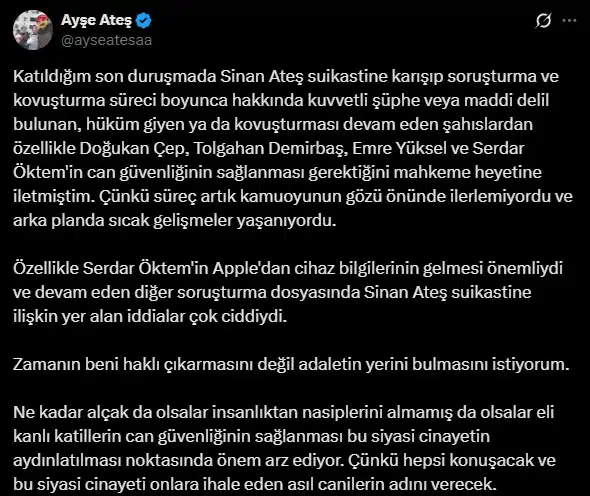 Özellikle Serdar Öktem’in Apple’dan cihaz bilgilerinin gelmesi önemliydi ve devam eden diğer soruşturma dosyasında Sinan Ateş suikastine ilişkin yer alan iddialar çok ciddiydi. Zamanın beni haklı çıkarmasını değil adaletin yerini bulmasını istiyorum.